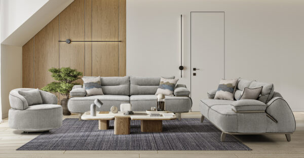 İnci Koltuk Takımı, yumuşak geçişli formu, açık gri tonları ve modern çizgisiyle yaşam alanlarına sade ama etkileyici bir hava katar. Geniş oturum yapısı, yuvarlak berjeri ve zarif metal detaylarıyla konforu çağdaş bir şıklıkla buluşturur.