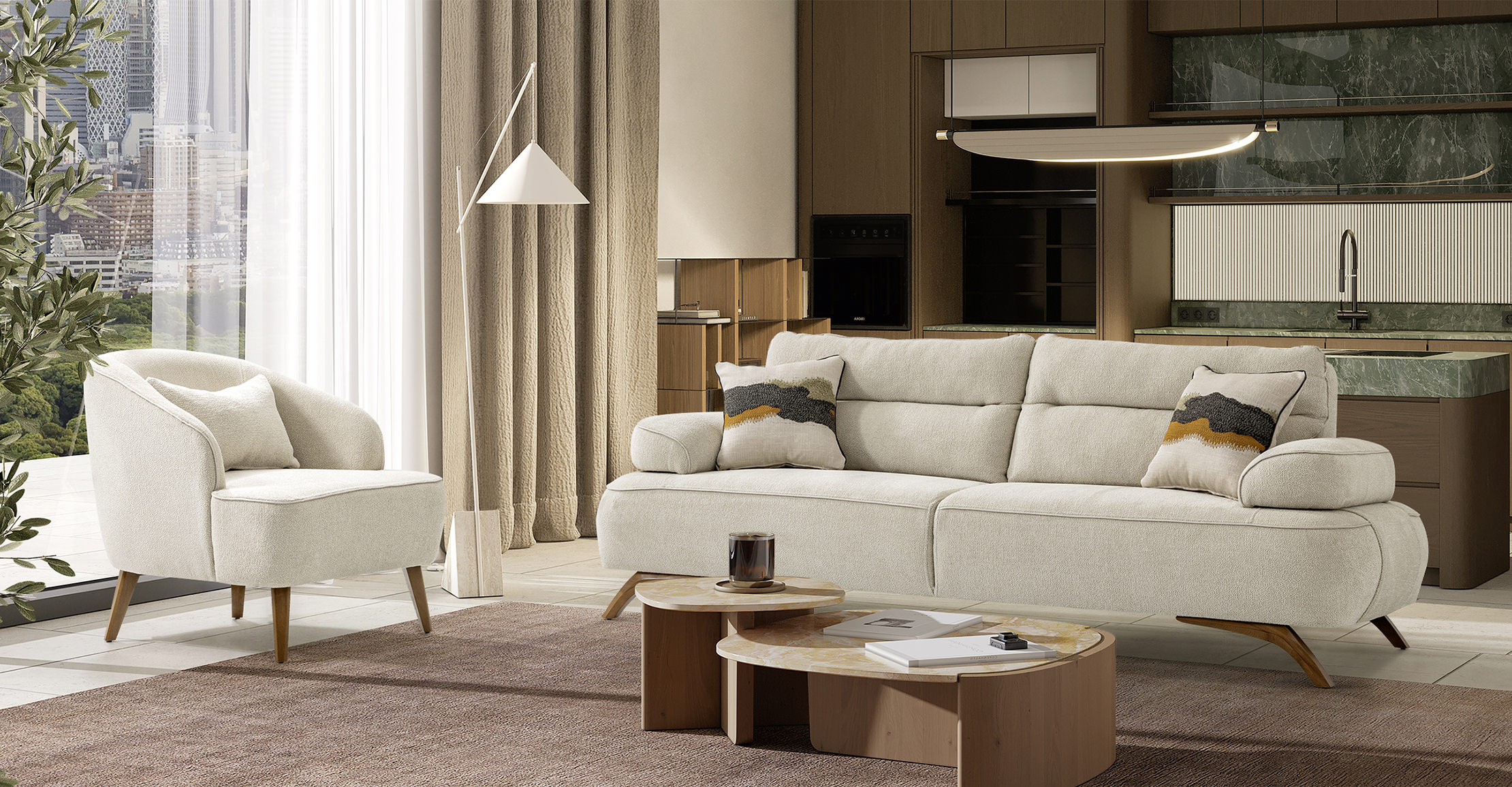 Opal Koltuk Takımı, sade ve modern tasarımını yumuşak dokusu ile buluşturarak yaşam alanlarına ferah ve zarif bir hava katar. Ahşap detayları ve konforlu yapısıyla şıklık ile rahatlığı bir arada sunar.